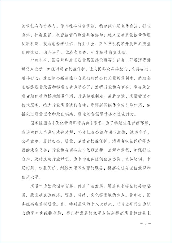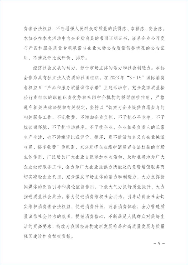 質(zhì)量是人類生產(chǎn)生活的重要保障。為努力開創(chuàng)質(zhì)量專業(yè)社團組織在新時代的新作用,大力推動經(jīng)營者質(zhì)量誠信自律,切實維護(hù)消費者合法權(quán)益,積極督促企業(yè)承諾產(chǎn)品和服務(wù)質(zhì)量主體責(zé)任,強化引領(lǐng)企業(yè)履行產(chǎn)品和服務(wù)質(zhì)量誠信承諾,切實營造公平競爭的市場環(huán)境和安全放心的消費環(huán)境,進(jìn)一步充分發(fā)揮質(zhì)量檢驗行業(yè)社團組織和質(zhì)量專業(yè)社團機構(gòu)在持續(xù)優(yōu)化營商環(huán)境、充分激發(fā)各類市場主體活力的橋梁紐帶作用,助力保障人民群眾享有高品質(zhì)生活,本協(xié)會決定按照章程賦予的職能職責(zé),繼續(xù)在2023年“3·15”國際消費者權(quán)益日活動中組織廣大重質(zhì)量、講誠信的優(yōu)秀企業(yè)開展“產(chǎn)品和服務(wù)質(zhì)量誠信承諾”主題活動,營造政府重視質(zhì)量、企業(yè)追求質(zhì)量、社會崇尚質(zhì)量、人人關(guān)心質(zhì)量的良好氛圍。