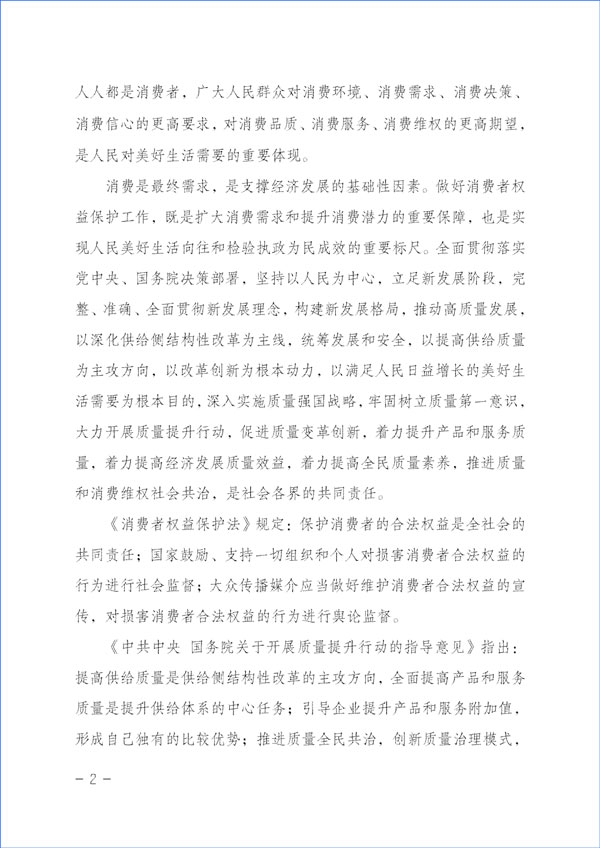 消費是最終需求,是支撐經(jīng)濟發(fā)展的基礎(chǔ)性因素。做好消費者權(quán)益保護(hù)工作,既是擴大消費需求和提升消費潛力的重要保障,也是實現(xiàn)人民美好生活向往和檢驗執(zhí)政為民成效的重要標(biāo)尺。全面貫徹落實黨中央、國務(wù)院決策部署,堅持以人民為中心,立足新發(fā)展階段,完整、準(zhǔn)確、全面貫徹新發(fā)展理念,構(gòu)建新發(fā)展格局,推動高質(zhì)量發(fā)展,以深化供給側(cè)結(jié)構(gòu)性改革為主線,統(tǒng)籌發(fā)展和安全,以提高供給質(zhì)量為主攻方向,以改革創(chuàng)新為根本動力,以滿足人民日益增長的美好生活需要為根本目的,深入實施質(zhì)量強國戰(zhàn)略,牢固樹立質(zhì)量第一意識,大力開展質(zhì)量提升行動,促進(jìn)質(zhì)量變革創(chuàng)新,著力提升產(chǎn)品和服務(wù)質(zhì)量,著力提高經(jīng)濟發(fā)展質(zhì)量效益,著力提高全民質(zhì)量素養(yǎng),推進(jìn)質(zhì)量和消費維權(quán)社會共治,是社會各界的共同責(zé)任。