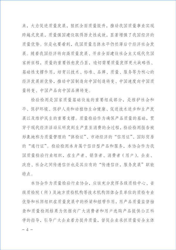 充分發(fā)揮質(zhì)量專業(yè)社團組織的中介作用,以習(xí)近平新時代中國特色社會主義思想為指導(dǎo),完整、準(zhǔn)確、全面貫徹新發(fā)展理念,加快構(gòu)建新發(fā)展格局,全面深化改革開放,堅持創(chuàng)新驅(qū)動發(fā)展,推動高質(zhì)量發(fā)展,堅持以供給側(cè)結(jié)構(gòu)性改革為主線,以滿足人民群眾日益增長的美好生活需要為根本目的,宣傳貫徹質(zhì)量領(lǐng)域的法律、法規(guī)、政策,組織質(zhì)量和質(zhì)量檢驗方面的標(biāo)準(zhǔn)研究、制定和技術(shù)開發(fā),開展質(zhì)量和質(zhì)量檢驗方面的學(xué)術(shù)交流、技術(shù)培訓(xùn)和相關(guān)技術(shù)咨詢與技術(shù)服務(wù);切實發(fā)揮“質(zhì)量檢驗,客觀公正,服務(wù)企業(yè),引導(dǎo)消費”的社會監(jiān)督作用,抓好質(zhì)量提升;精業(yè)篤行,扶優(yōu)治劣,充分利用全國各省(自治區(qū)、直轄市)質(zhì)檢院(所)和重點國家級質(zhì)檢中心與相關(guān)質(zhì)檢機構(gòu)等副會長、常務(wù)理事、理事單位和技術(shù)機構(gòu)會員單位的專業(yè)優(yōu)勢,組織開展“3.15”“質(zhì)量月”等質(zhì)量誠信主題(專題)宣傳活動,對“全國質(zhì)量檢驗穩(wěn)定合格產(chǎn)品”進(jìn)行調(diào)查匯總和展示公告,推廣防偽溯源和質(zhì)量誠信驗證等技術(shù)應(yīng)用,傳遞質(zhì)量信任,引導(dǎo)質(zhì)量消費,維護(hù)市場公平競爭,營造良好市場環(huán)境,加強市場引導(dǎo),共筑質(zhì)量誠信,推動質(zhì)量社會共治共享;組織新技術(shù)、新產(chǎn)品鑒定和評審,對產(chǎn)品質(zhì)量、服務(wù)質(zhì)量、工程質(zhì)量開展檢驗、鑒定、監(jiān)理方面的咨詢和服務(wù);樹立質(zhì)量工作先進(jìn)典型和質(zhì)量誠信標(biāo)桿,弘揚工匠精神,推廣質(zhì)量工作優(yōu)秀示范的先進(jìn)經(jīng)驗;承辦有關(guān)政府部門(機構(gòu))交辦和委托的相關(guān)工作;著力發(fā)揮全國質(zhì)量檢驗行業(yè)組織的橋梁紐帶作用,科學(xué)求實,開拓創(chuàng)新,全面引領(lǐng)質(zhì)量檢驗行業(yè)自律和健康發(fā)展;履行質(zhì)量專業(yè)社團中介機構(gòu)的相關(guān)職能,激發(fā)市場主體活力,大力開展質(zhì)量提升行動,督促企業(yè)履行質(zhì)量主體責(zé)任,助力企業(yè)高質(zhì)量發(fā)展,助推產(chǎn)業(yè)轉(zhuǎn)型升級,大力營造“政府重視質(zhì)量、企業(yè)追求質(zhì)量、社會崇尚質(zhì)量、人人關(guān)心質(zhì)量”的濃厚氛圍,合力推進(jìn)質(zhì)量社會共治,扎實推進(jìn)質(zhì)量強國建設(shè)。