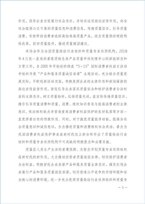 本協(xié)會作為全國質(zhì)量檢驗行業(yè)組織和質(zhì)量專業(yè)社團機構(gòu),2018年4月前一直承擔(dān)著原質(zhì)檢總局產(chǎn)品質(zhì)量申訴處理中心的職能職責(zé)和日常工作,自2000年開始就持續(xù)在“3·15”國際消費者權(quán)益日活動中組織開展“產(chǎn)品和服務(wù)質(zhì)量誠信承諾”主題活動,充分結(jié)合質(zhì)量發(fā)展實際,不斷創(chuàng)新活動內(nèi)容,積極發(fā)揮企業(yè)的主體作用和新聞媒體的輿論宣傳監(jiān)督作用,督促引導(dǎo)企業(yè)落實質(zhì)量安全和維護(hù)消費者合法權(quán)益的主體責(zé)任,樹立質(zhì)量標(biāo)桿,弘揚質(zhì)量先進(jìn),在宣傳傳遞質(zhì)量信任、推介引導(dǎo)質(zhì)量消費和質(zhì)量、消費、維權(quán)知識普及與提高消費者的主體意識、依法維權(quán)能力并營造重視消費者權(quán)益保護(hù)的良好氛圍等方面一直發(fā)揮著應(yīng)有的積極作用。同時,對于激發(fā)質(zhì)量提升動能,提高全社會質(zhì)量意識和誠信意識,合力推進(jìn)質(zhì)量和消費維權(quán)社會共治,著力為我國消費者權(quán)益保護(hù)事業(yè)在新時代邁上新臺階作出了質(zhì)量檢驗行業(yè)組織和質(zhì)量專業(yè)社團機構(gòu)不可或缺的積極努力和必要貢獻(xiàn)。