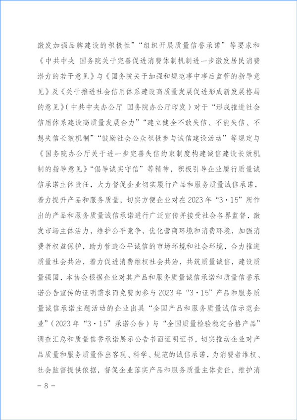 為貫徹落實《中共中央關(guān)于堅持和完善中國特色社會主義制度 推進(jìn)國家治理體系和治理能力現(xiàn)代化若干重大問題的決定》對于“強化消費者權(quán)益保護(hù)”的重要精神和《中共中央 國務(wù)院關(guān)于開展質(zhì)量提升行動的指導(dǎo)意見》與《質(zhì)量強國建設(shè)綱要》對于“推廣實施優(yōu)質(zhì)服務(wù)承諾標(biāo)識和管理制度,培育知名服務(wù)品牌,全面實施企業(yè)標(biāo)準(zhǔn)自我聲明公開和監(jiān)督制度”等重要部署及《國務(wù)院關(guān)于建立完善守信聯(lián)合激勵和失信聯(lián)合懲戒制度加快推進(jìn)社會誠信建設(shè)的指導(dǎo)意見》對于“健全褒揚和激勵誠信行為機制”“多渠道選樹誠信典型”“引導(dǎo)企業(yè)主動發(fā)布綜合信用承諾或產(chǎn)品和服務(wù)質(zhì)量等專項承諾”及《建設(shè)高標(biāo)準(zhǔn)市場體系行動方案》(中共中央辦公廳、國務(wù)院辦公廳印發(fā))關(guān)于“健全社會監(jiān)督”和《國務(wù)院辦公廳關(guān)于開展消費品工業(yè)“三品”專項行動營造良好市場環(huán)境的若干意見》有關(guān)“加強輿論引導(dǎo),地方各級政府和行業(yè)協(xié)會要表彰和宣傳品牌建設(shè)成就突出的企業(yè)和企業(yè)家,激發(fā)加強品牌建設(shè)的積極性”“組織開展質(zhì)量信譽承諾”等要求和《中共中央 國務(wù)院關(guān)于完善促進(jìn)消費體制機制進(jìn)一步激發(fā)居民消費潛力的若干意見》與《國務(wù)院關(guān)于加強和規(guī)范事中事后監(jiān)管的指導(dǎo)意見》及《關(guān)于推進(jìn)社會信用體系建設(shè)高質(zhì)量發(fā)展促進(jìn)形成新發(fā)展格局的意見》(中共中央辦公廳 國務(wù)院辦公廳印發(fā))對于“形成推進(jìn)社會信用體系建設(shè)高質(zhì)量發(fā)展合力”“建立健全不敢失信、不能失信、不想失信長效機制”“鼓勵社會公眾積極參與誠信建設(shè)活動”等規(guī)定與《國務(wù)院辦公廳關(guān)于進(jìn)一步完善失信約束制度構(gòu)建誠信建設(shè)長效機制的指導(dǎo)意見》“倡導(dǎo)誠實守信”等精神,積極引導(dǎo)企業(yè)履行質(zhì)量誠信承諾主體責(zé)任,大力督促企業(yè)切實履行產(chǎn)品和服務(wù)質(zhì)量誠信承諾,著力提升產(chǎn)品和服務(wù)質(zhì)量,切實方便企業(yè)對在2023年“3·15”所作出的產(chǎn)品和服務(wù)質(zhì)量誠信承諾進(jìn)行廣泛宣傳并接受社會各界監(jiān)督,激發(fā)市場主體活力,維護(hù)公平競爭,優(yōu)化營商環(huán)境和消費環(huán)境,加強消費者權(quán)益保護(hù),助力營造公平誠信的市場環(huán)境和社會環(huán)境,合力推進(jìn)質(zhì)量社會共治,著力促進(jìn)消費維權(quán)社會共治,共筑質(zhì)量誠信,建設(shè)質(zhì)量強國,本協(xié)會根據(jù)企業(yè)對其產(chǎn)品和服務(wù)質(zhì)量誠信承諾和質(zhì)量信譽承諾公告宣傳的證明需求而免費向參與2023年“3·15”產(chǎn)品和服務(wù)質(zhì)量誠信承諾主題活動的企業(yè)出具“全國產(chǎn)品和服務(wù)質(zhì)量誠信示范企業(yè)”(2023年“3·15”承諾公告)與“全國質(zhì)量檢驗穩(wěn)定合格產(chǎn)品”調(diào)查匯總和質(zhì)量信譽承諾展示公告書面證明證書,切實推動企業(yè)對產(chǎn)品質(zhì)量和服務(wù)質(zhì)量作出客觀、科學(xué)、規(guī)范的誠信承諾,為消費者維權(quán)、社會監(jiān)督提供依據(jù),督促企業(yè)落實產(chǎn)品和服務(wù)質(zhì)量主體責(zé)任,維護(hù)消費者合法權(quán)益,不斷增強人民群眾對質(zhì)量的獲得感、幸福感、安全感。本協(xié)會在本次活動中向企業(yè)所出具的書面證明證書,謹(jǐn)系企業(yè)公開發(fā)布產(chǎn)品和服務(wù)質(zhì)量專項承諾與企業(yè)主動公告質(zhì)量信譽情況的公告證明,不涉及評比或評價、排序。