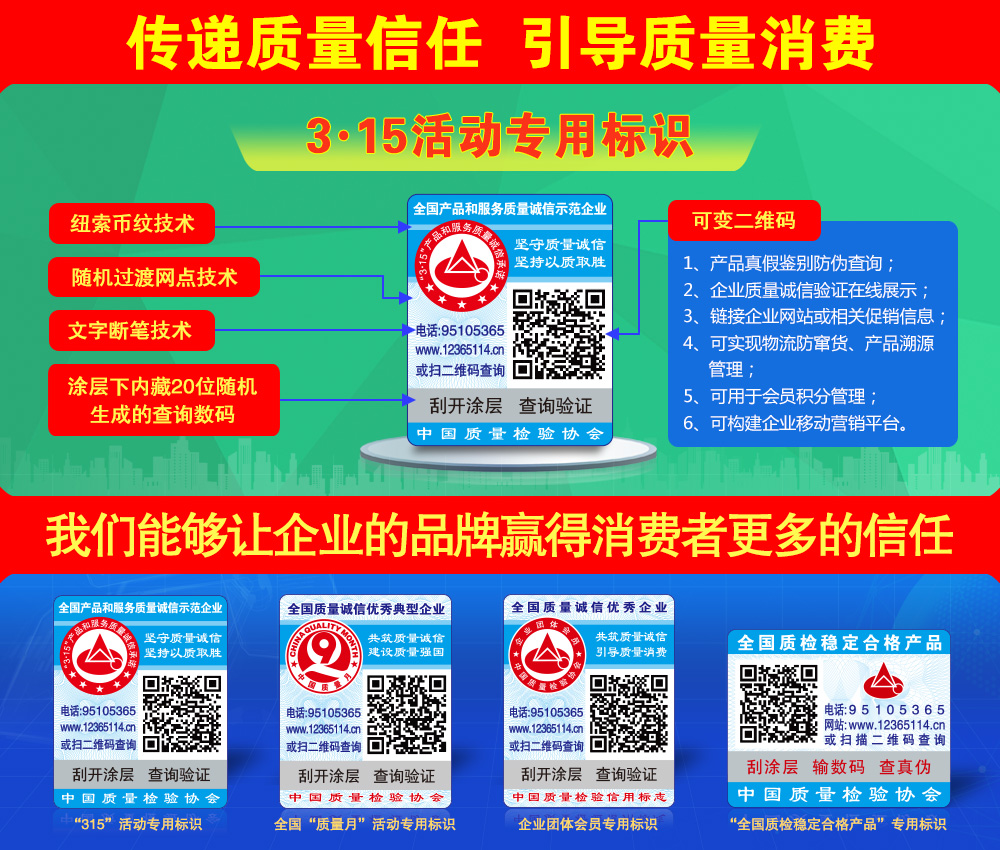 中國(guó)質(zhì)量檢驗(yàn)協(xié)會(huì)防偽溯源和物流管理服務(wù)系統(tǒng)(簡(jiǎn)稱中檢聯(lián)合質(zhì)量誠(chéng)信驗(yàn)證系統(tǒng))是以物聯(lián)網(wǎng)、大數(shù)據(jù)、云計(jì)算、區(qū)塊鏈和移動(dòng)互聯(lián)網(wǎng)技術(shù)為基礎(chǔ)建設(shè)的全過(guò)程防偽溯源與質(zhì)量誠(chéng)信驗(yàn)證服務(wù)平臺(tái),依托廣大技術(shù)機(jī)構(gòu)的技術(shù)支撐,應(yīng)用二維碼為載體,使用一物一碼防偽技術(shù),同時(shí)采用文字、圖片和視頻等多媒體方式,完整記錄產(chǎn)品的原料來(lái)源、生產(chǎn)加工、倉(cāng)儲(chǔ)物流和市場(chǎng)銷售等詳細(xì)信息,融合實(shí)現(xiàn)產(chǎn)品質(zhì)量來(lái)源可查、去向可追、責(zé)任可究的全過(guò)程追溯,切實(shí)方便企業(yè)履行質(zhì)量安全主體責(zé)任并用科技、智能化、信息化的手段去加強(qiáng)質(zhì)量安全風(fēng)險(xiǎn)控制,維護(hù)消費(fèi)者合法權(quán)益,讓人民群眾買得放心、吃得放心、用得放心...
