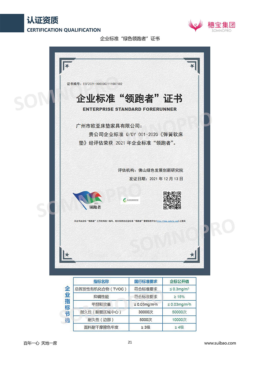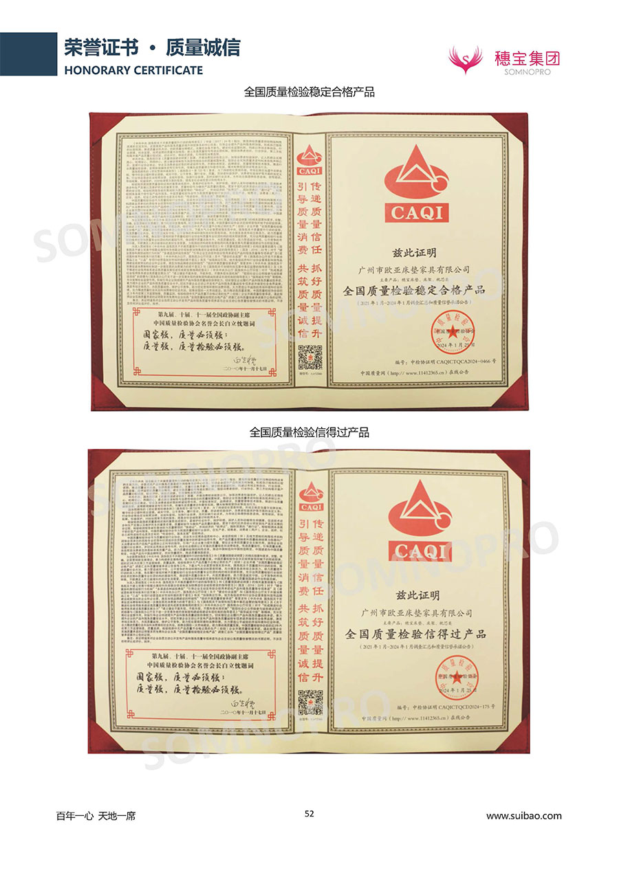 本著高品質(zhì)、高效率、重管理的原則,穗寶已通過ISO9001質(zhì)量管理體系認(rèn)證證書、ISO14001環(huán)境管理體系認(rèn)證證書、ISO45001職業(yè)健康安全管理體系認(rèn)證證書、中國(guó)環(huán)境標(biāo)志產(chǎn)品認(rèn)證證書、家居綠色環(huán)保領(lǐng)跑品牌、綠色正品家居品牌、企業(yè)標(biāo)準(zhǔn)“綠色領(lǐng)跑者”證書、CMS測(cè)量管理體系證書、CMS測(cè)量管理體系證書附件、廣東省“守信用重合同”企業(yè)、廣州歐亞-納稅信用A級(jí)納稅人(連續(xù)5年:2018-2022)、2024年中國(guó)500最具價(jià)值品牌,品牌價(jià)值高達(dá)302.89億元、廣東高價(jià)值商標(biāo)品牌(穗寶)、廣東省重點(diǎn)商標(biāo)保護(hù)名錄納入證明、廣州市勞動(dòng)關(guān)系和諧企業(yè)AA級(jí)。穗寶自創(chuàng)立以來,不斷致力于新產(chǎn)品的設(shè)計(jì)與研發(fā),多次在國(guó)內(nèi)家具展會(huì)屢獲獎(jiǎng)項(xiàng),產(chǎn)品暢銷國(guó)內(nèi)外,深受客戶一致好評(píng)。