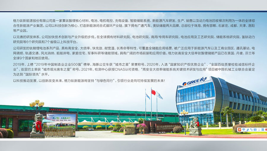 格力鈦新能源股份有限公司是一家集鈦酸鋰核心材料、電池、電機(jī)電控、充電設(shè)備、智能儲(chǔ)能系統(tǒng)、新能源汽車研發(fā)、生產(chǎn)、銷售以及動(dòng)力電池回收梯次利用為一體的全球綜合性新能源產(chǎn)業(yè)集團(tuán)。格力鈦新能源以科技創(chuàng)新為核心,打造新能源閉合式循環(huán)產(chǎn)業(yè)鏈,旗下?lián)碛袕V通汽車、奧鈦儲(chǔ)能兩大品牌,總部位于珠海,擁有邯鄲、石家莊、成都、天津、洛陽(yáng)等產(chǎn)業(yè)園。