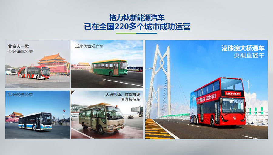 目前,格力鈦生產(chǎn)的新能源汽車于北京、杭州、武漢、青島、哈爾濱、包頭、??诘热珖?guó)220多個(gè)城市運(yùn)營(yíng)。2014年,仿古鐺鐺車榮膺第22屆北京APEC會(huì)議官方指定用車、登陸北京環(huán)天安門(mén)旅游觀光線。2016年,雙層巴士榮膺第二屆中美低碳峰會(huì)指定用車、登陸國(guó)內(nèi)首條純電動(dòng)雙層觀光車線路——北京城市旅游觀光3線。2017年,18米海豚公交車投入北京長(zhǎng)安街1路運(yùn)營(yíng)。2018年,港珠澳大橋正式通車,雙層巴士擔(dān)綱中央廣播電視總臺(tái)直播車,成為首輛駛上港珠澳大橋的大巴車。