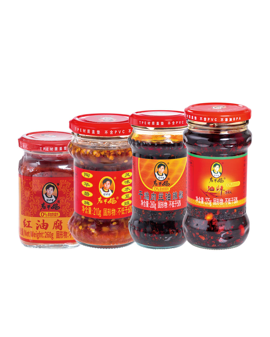 主要產(chǎn)品:老干媽牌油辣椒系列(油辣椒、風(fēng)味豆豉、香菇、精制牛肉末豆豉、辣三丁、香辣脆、干煸肉絲、風(fēng)味雞、肉絲豆豉)、火鍋底料(糟辣椒/植物油)、香辣醬、下飯菜、拌飯醬、風(fēng)味水豆豉、紅油腐乳、風(fēng)味腐乳、香辣菜、風(fēng)味糟辣剁椒(中辣/微辣)、姜蒜糟辣剁椒、番茄辣醬