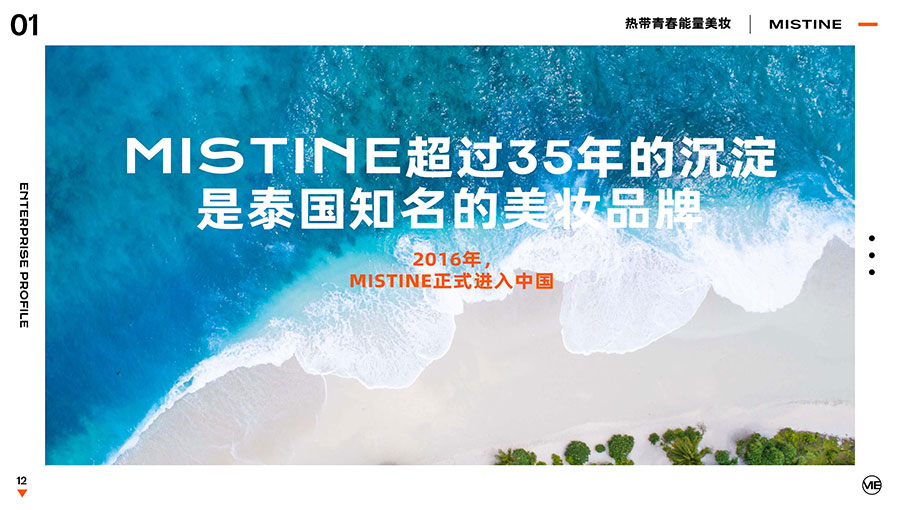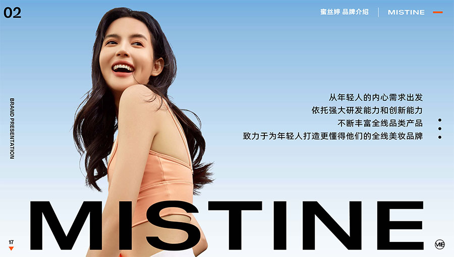 MISTINE蜜絲婷1988年始源于泰國(guó),作為知名國(guó)際美妝品牌,擁有超過(guò)35年的科研底蘊(yùn),產(chǎn)品種類涵蓋防曬、美妝、護(hù)膚、香水、個(gè)護(hù)五大類,擁有近6000多個(gè)單品暢銷(xiāo)全球20多個(gè)國(guó)家,專注為全球女性提供豐富、安全、高品質(zhì)的美妝產(chǎn)品。自2016年進(jìn)入中國(guó)后,MISTINE蜜絲婷以“熱帶青春能量美妝”為品牌定位,為年輕人打造更懂得他們的全新美妝產(chǎn)品,并傳遞獨(dú)特的健康活力生活方式。