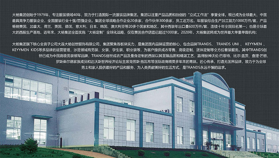 大楊集團(tuán)創(chuàng)建于1979年,總部位于遼寧省大連市,主要生產(chǎn)和銷售各類中高檔服裝產(chǎn)品為主的國際化大型服裝企業(yè),以西裝縫制享譽(yù)全球,是世界重要的西裝生產(chǎn)加工基地?,F(xiàn)有直屬(控股)成員企業(yè)20家,員工4500人。控股子公司大連大楊創(chuàng)世股份有限公司2000年在上海證券交易所上市,并于2016年完成重大資產(chǎn)重組。