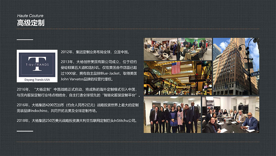 目前,大楊集團(tuán)全球營銷網(wǎng)絡(luò)已遍布美國、加拿大、荷蘭、英國、澳大利亞及日本等27個國家和地區(qū),開設(shè)單裁合作店面上千家,與加拿大互聯(lián)網(wǎng)定制巨頭Indochino公司、澳大利亞知名男裝定制企業(yè)Institchu公司、美國服裝巨頭TBI公司簽署戰(zhàn)略合作協(xié)議,年定制產(chǎn)品數(shù)量已突破200萬件/套,具備西裝、襯衫、休閑裝以及大衣、風(fēng)衣等全品類定制生產(chǎn)能力。
