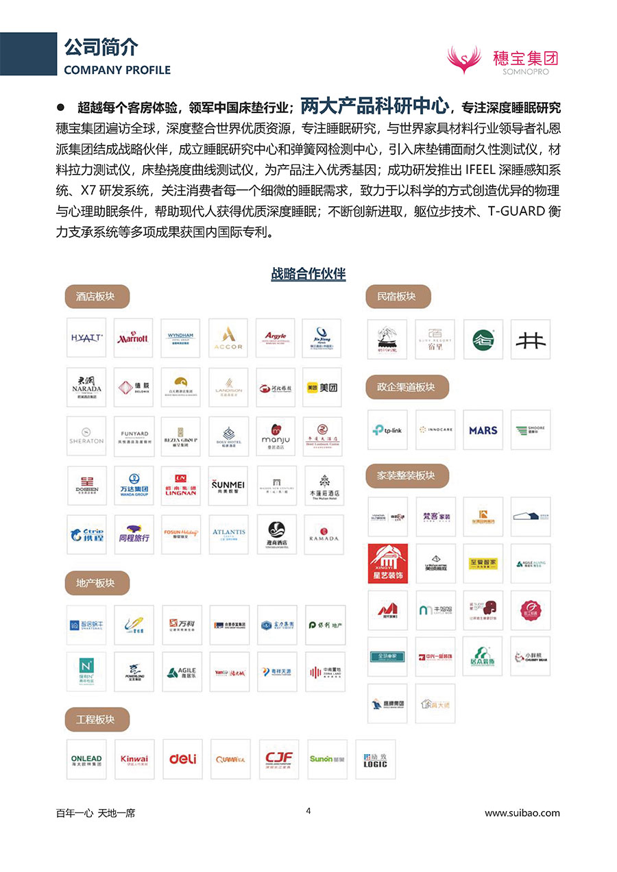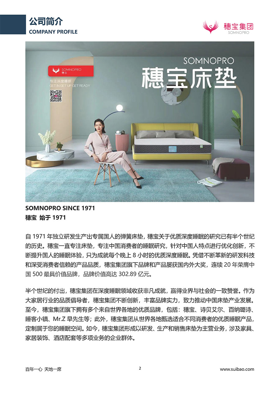 半個世紀的付出,穗寶集團在深度睡眠領(lǐng)域收獲非凡成就,贏得業(yè)界與社會的一致贊譽。作為大家居行業(yè)的品質(zhì)倡導者,穗寶集團不斷創(chuàng)新,豐富品牌實力,致力推動中國床墊產(chǎn)業(yè)發(fā)展。至今,穗寶集團旗下?lián)碛卸鄠€來自世界各地的優(yōu)質(zhì)品牌,包括:穗寶、詩貝艾爾、百納璐詩、睡客小鎮(zhèn)、Mr.Z早先生等;此外,穗寶集團從世界各地甄選適合不同消費者的優(yōu)質(zhì)睡眠產(chǎn)品,定制屬于您的睡眠空間。如今,穗寶集團形成以研發(fā)、生產(chǎn)和銷售床墊為主營業(yè)務,涉及家具、家居裝飾、酒店配套等多項業(yè)務的企業(yè)群體。