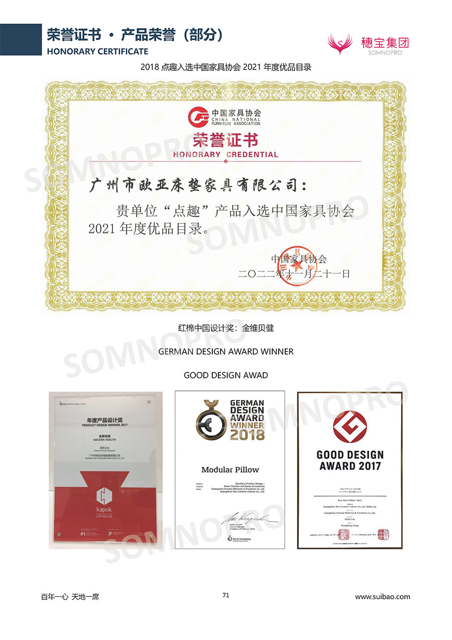 自1971年獨立研發(fā)生產(chǎn)出專屬國人的彈簧床墊,穗寶關(guān)于優(yōu)質(zhì)深度睡眠的研究已有半個世紀的歷史。穗寶一直專注床墊,專注中國消費者的睡眠研究,針對中國人特點進行優(yōu)化創(chuàng)新,不斷提升國人的睡眠體驗,只為成就每個晚上8小時的優(yōu)質(zhì)深度睡眠。憑借不斷革新的研發(fā)科技和深受消費者信賴的產(chǎn)品品質(zhì),穗寶集團旗下品牌和產(chǎn)品屢獲國內(nèi)外大獎,連續(xù)20年榮膺中國500最具價值品牌,品牌價值高達302.89億元。