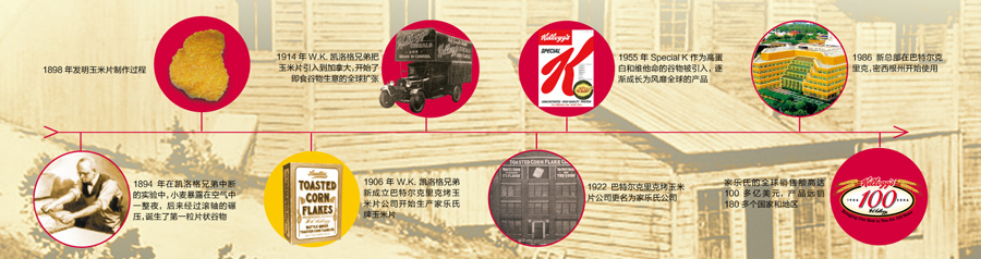 一百多年來(lái),家樂氏公司秉承“更健康、更營(yíng)養(yǎng)美味和更高質(zhì)量”的信念以及“天然和優(yōu)質(zhì)”的高尚品質(zhì),不斷地推陳出新,先后推出系列經(jīng)典 產(chǎn)品如All-Bran®(1916年)和 Rice Krispies®(1928年)。隨著業(yè)務(wù)的發(fā)展,家樂氏公司開始拓展國(guó)際業(yè)務(wù):1914年Kellogg’s Corn Flakes®產(chǎn)品進(jìn)軍加拿大市場(chǎng),1924年和1938年分別在澳大利亞的悉尼、英格蘭的曼徹斯特設(shè)立工廠。2007年,家樂氏成功進(jìn)入中國(guó),并以銷售額接近120億美金的業(yè)績(jī)成為全球谷物食品和方便食品的領(lǐng)頭者,產(chǎn)品包括谷物類早餐、餅干、克力架、糕點(diǎn)、果味小食、燕麥餅干棒、冷凍華夫以及素食產(chǎn)品等。2012年6月,家樂氏在全球成功收購(gòu)品客品牌,使家樂氏的休閑產(chǎn)品成為繼谷物產(chǎn)品之后的第二大品牌。