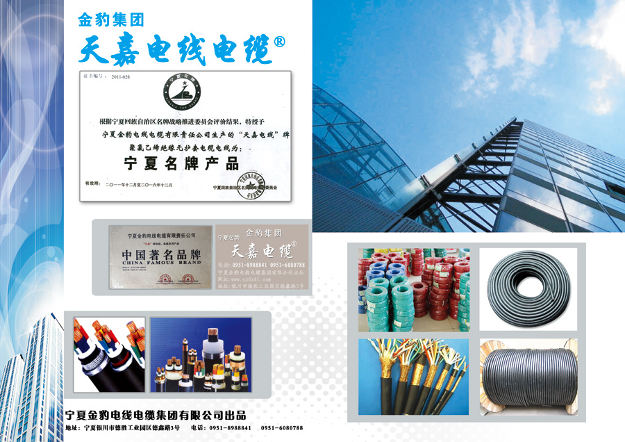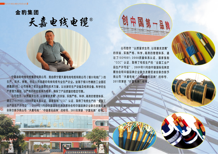 公司信守“以質(zhì)量求生存,以信譽求發(fā)展”的宗旨,實施嚴(yán)格、科學(xué)、高效的管理體系,通過了ISO9001:2008質(zhì)量體系認證,國家強制“CCC”認證,取得了電纜生產(chǎn)的“全國工業(yè)產(chǎn)品生產(chǎn)許可證”,2009年由中國國際名牌發(fā)展協(xié)會和中國品牌企業(yè)聯(lián)合發(fā)展促進會聯(lián)合授予公司“天嘉電線®”“中國著名品牌”的稱號,2011年榮獲“寧夏名牌”稱號。公司是寧夏質(zhì)量管理協(xié)會副會長單位、銀川市質(zhì)量管理協(xié)會理事單位、賀蘭縣質(zhì)量管理協(xié)會理事單位、中國電器工業(yè)協(xié)會電線電纜分會會員單位。