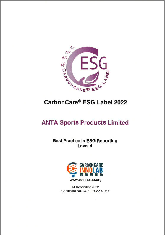 此外,安踏集團于低碳想創(chuàng)坊(Carbon Care Innovation Lab)中獲頒「ESG報告最佳匯報實踐第四級」,較去年提升兩級,反映集團ESG報告表現(xiàn)優(yōu)異,在公司董事局的問責度、實質性評估、社會關鍵績效指標的披露,以及企業(yè)氣候行動的努力亦得到外界的認可。安踏集團曾于過往連續(xù)三年成功取得「低碳關懷標簽」,因此本年度獲額外頒發(fā)「低碳關懷星級標簽」,以表彰過往在ESG方面的成果。