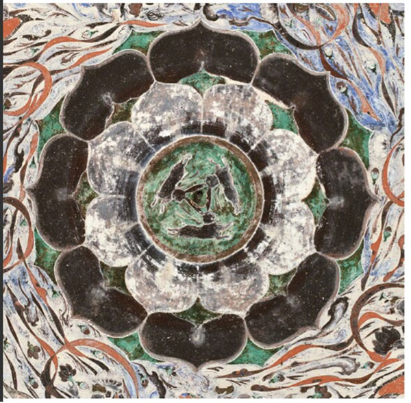 「三兔共耳」源于敦煌石窟第407窟頂中央藻井的“三兔聯(lián)跑蓮花紋”。在這個(gè)開(kāi)鑿于隋代的洞窟中,窟頂中央繪制了數(shù)層八瓣大蓮花;周遭環(huán)繞著衣帶飄飄、手持花盤(pán)的飛天形象;蓮花中心則繪制了三只追逐奔跑的兔子。畫(huà)師以巧思將每只兔子二只耳朵中的一只重疊,看似三兔三耳,但以每只兔子各自的角度觀察,則雙耳俱全。三只兔耳組成等邊三角形,配合外圍的蓮瓣與飛天,不僅兔子奔跑跳躍的神態(tài)生動(dòng)逼真,整個(gè)藻井紋飾也都充滿了動(dòng)感!