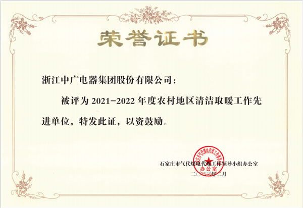 日前,浙江中廣電器集團股份有限公司榮獲由石家莊市氣代煤電代煤工作領(lǐng)導小組辦公室授予的“2021-2022年度農(nóng)村地區(qū)清潔取暖工作先進單位”榮譽稱號,以此表彰以中廣電器集團在當?shù)剞r(nóng)村地區(qū)清潔取暖工作中所作出的杰出貢獻。