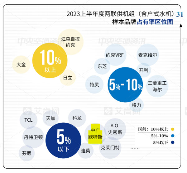 2023上半年,中廣歐特斯在渠道推廣和產(chǎn)品研發(fā)上不斷發(fā)力,兩聯(lián)供機(jī)組市場(chǎng)開(kāi)拓取得了一定的成績(jī),并在2023上半年度兩聯(lián)供機(jī)組(含戶(hù)式水機(jī))樣本品牌占有率上展示出一定的表現(xiàn)力,與科龍中央空調(diào)、天加、TCL智能暖通等國(guó)貨品牌并肩前行,占有率均為5%以下。