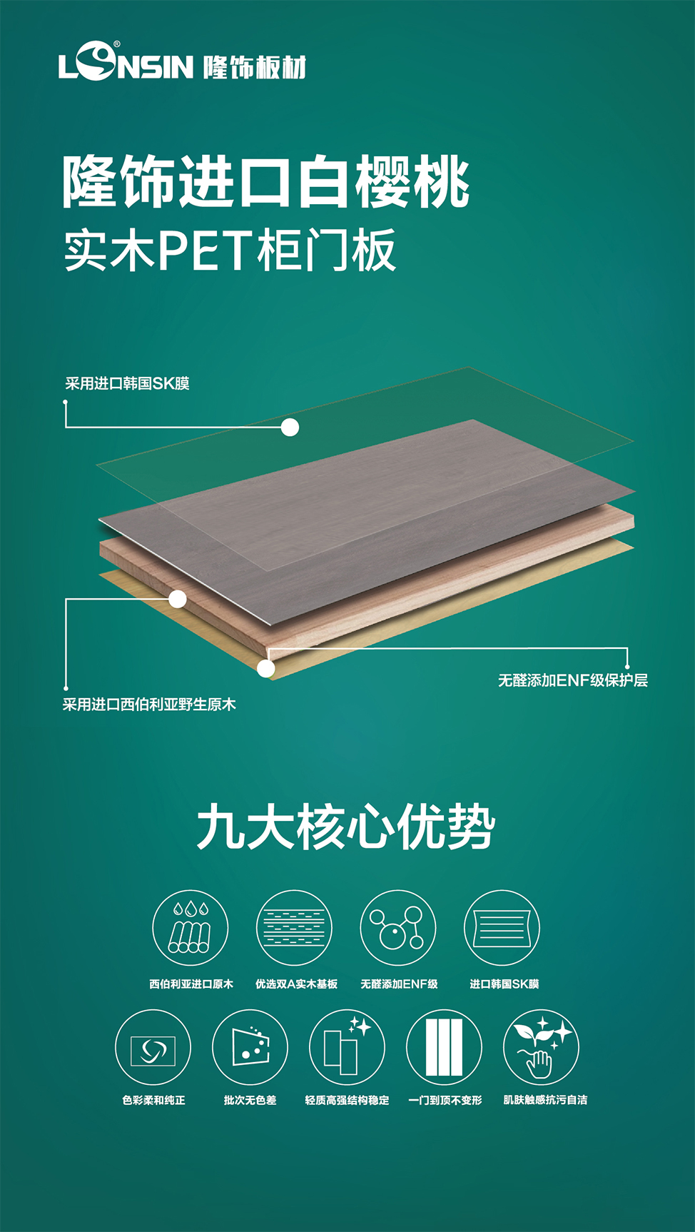 “提升高品質(zhì)服務(wù)、推動綠色家居產(chǎn)業(yè)發(fā)展”是隆飾板材一直以來的發(fā)展使命,多年來,隆飾從未停止研發(fā)創(chuàng)新的步伐,不斷與時俱進(jìn),將“工匠精神”融入每一個環(huán)節(jié)中,打造更具競爭力的優(yōu)勢產(chǎn)品和服務(wù)。不僅有一直引以為傲的ENF級生態(tài)板和市場大熱的家具板,隆飾還將重磅推出全新高端產(chǎn)品——“ENF級進(jìn)口白櫻桃高端實木精板”,滿足了消費者對環(huán)保和品質(zhì)愈發(fā)強烈的追求。