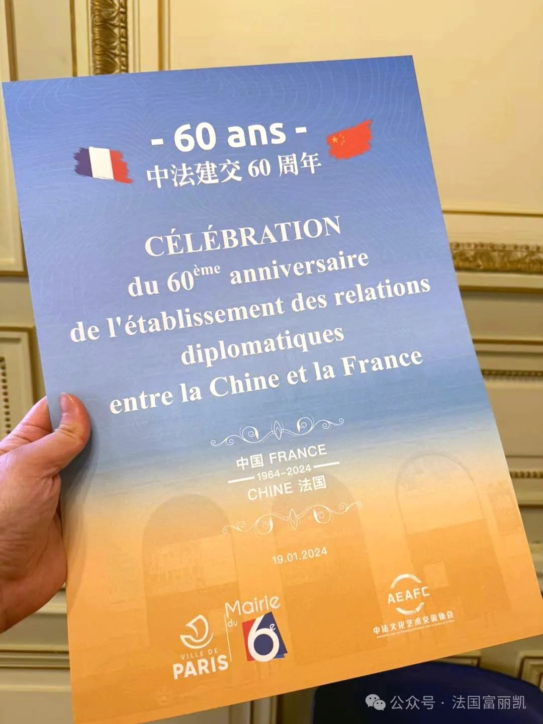 1月27日是中法建交60周年紀(jì)念日,日前由中法文化藝術(shù)交流協(xié)會(huì)(AEAFC)主辦的慶祝中法建交60周年文藝演出在巴黎6區(qū)政府禮堂舉行。巴黎6區(qū)政府、中國(guó)駐法使館等相關(guān)政府工作人員、歐洲時(shí)報(bào)、全球公益聯(lián)盟等組織負(fù)責(zé)人等出席活動(dòng),共話新時(shí)期大國(guó)友誼的現(xiàn)實(shí)意義及長(zhǎng)遠(yuǎn)影響。60周年、巴黎6區(qū),也寄寓著對(duì)中法交往六六大順的期盼。
