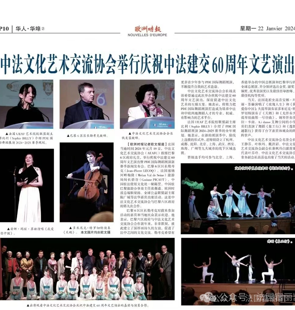 1月22日,巴黎當(dāng)?shù)刂形拿襟w《歐洲時(shí)報(bào)》對(duì)中法文化藝術(shù)交流協(xié)會(huì)慶祝中法建交60周年活動(dòng)的報(bào)道,刊登了法國(guó)富麗凱參加活動(dòng)的照片。