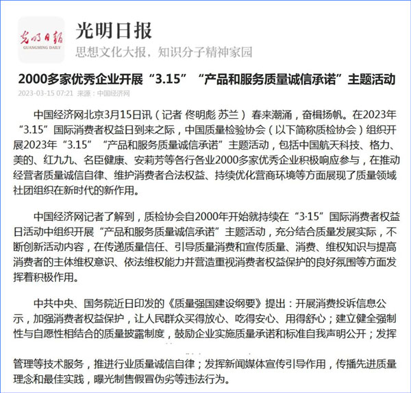 中國經(jīng)濟(jì)網(wǎng):2000多家優(yōu)秀企業(yè)開展“3·15”“產(chǎn)品和服務(wù)質(zhì)量誠信承諾”主題活動