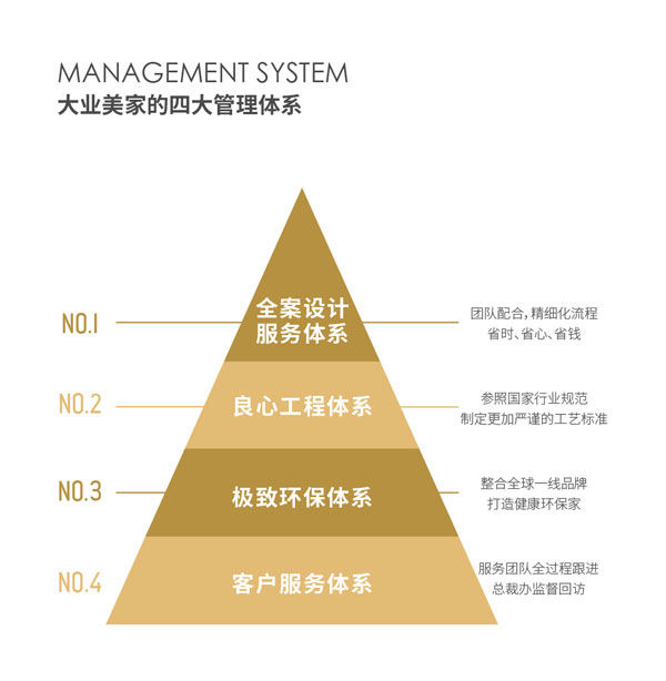 從前期的商務(wù)人員、客戶管家和客戶的接觸,到全案設(shè)計師、深化設(shè)計師、產(chǎn)品設(shè)計師、配飾設(shè)計師,再到工程監(jiān)理、項目經(jīng)理,各工種施工人員和工程部經(jīng)理,甚至我們合作廠家的產(chǎn)品配送安裝人員,這整個團隊給客戶提供的服務(wù)一定是一以貫之,同一個服務(wù)質(zhì)量水準的,這個水準就是“好家裝 更輕松”,目的是讓客戶覺得找到大業(yè)美家裝修就是省心,放心的!