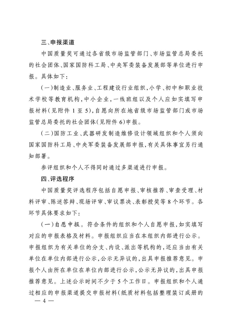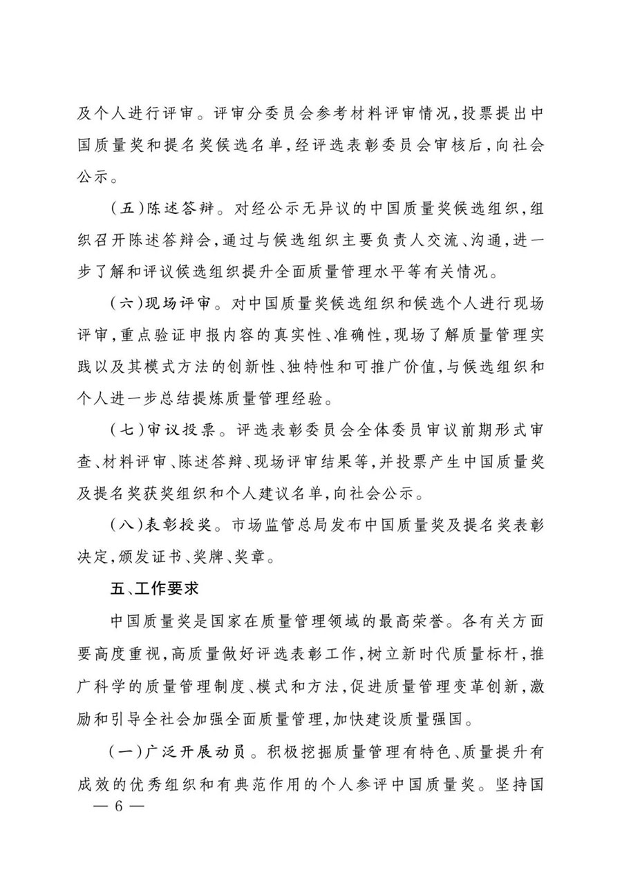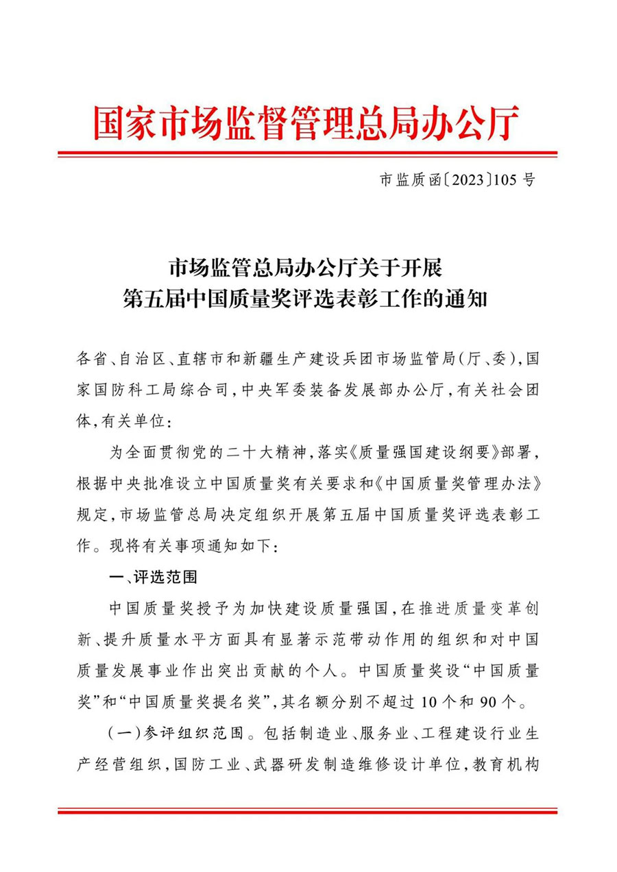為全面貫徹黨的二十大精神,落實《質(zhì)量強國建設(shè)綱要》部署,根據(jù)中央批準(zhǔn)設(shè)立中國質(zhì)量獎有關(guān)要求和《中國質(zhì)量獎管理辦法》規(guī)定,市場監(jiān)管總局決定組織開展第五屆中國質(zhì)量獎評選表彰工作?,F(xiàn)將有關(guān)事項通知如下: