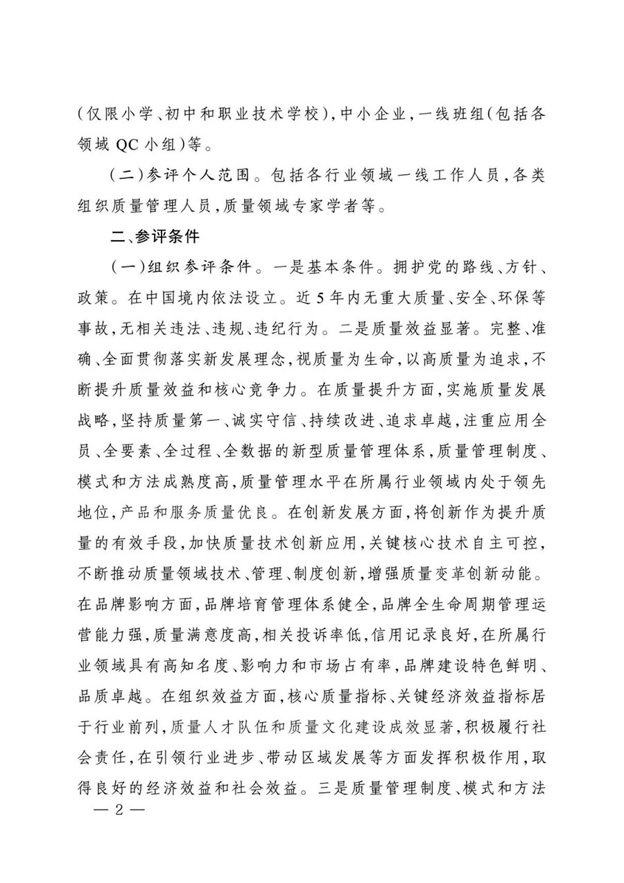 (一)組織參評條件。一是基本條件。擁護黨的路線、方針、政策。在中國境內(nèi)依法設(shè)立。近5年內(nèi)無重大質(zhì)量、安全、環(huán)保等事故,無相關(guān)違法、違規(guī)、違紀(jì)行為。二是質(zhì)量效益顯著。完整、準(zhǔn)確、全面貫徹落實新發(fā)展理念,視質(zhì)量為生命,以高質(zhì)量為追求,不斷提升質(zhì)量效益和核心競爭力。在質(zhì)量提升方面,實施質(zhì)量發(fā)展戰(zhàn)略,堅持質(zhì)量第一、誠實守信、持續(xù)改進(jìn)、追求卓越,注重應(yīng)用全員、全要素、全過程、全數(shù)據(jù)的新型質(zhì)量管理體系,質(zhì)量管理制度、模式和方法成熟度高,質(zhì)量管理水平在所屬行業(yè)領(lǐng)域內(nèi)處于領(lǐng)先地位,產(chǎn)品和服務(wù)質(zhì)量優(yōu)良。在創(chuàng)新發(fā)展方面,將創(chuàng)新作為提升質(zhì)量的有效手段,加快質(zhì)量技術(shù)創(chuàng)新應(yīng)用,關(guān)鍵核心技術(shù)自主可控,不斷推動質(zhì)量領(lǐng)域技術(shù)、管理、制度創(chuàng)新,增強質(zhì)量變革創(chuàng)新動能。在品牌影響方面,品牌培育管理體系健全,品牌全生命周期管理運營能力強,質(zhì)量滿意度高,相關(guān)投訴率低,信用記錄良好,在所屬行業(yè)領(lǐng)域具有高知名度、影響力和市場占有率,品牌建設(shè)特色鮮明、品質(zhì)卓越。在組織效益方面,核心質(zhì)量指標(biāo)、關(guān)鍵經(jīng)濟效益指標(biāo)居于行業(yè)前列,質(zhì)量人才隊伍和質(zhì)量文化建設(shè)成效顯著,積極履行社會責(zé)任,在引領(lǐng)行業(yè)進(jìn)步、帶動區(qū)域發(fā)展等方面發(fā)揮積極作用,取得良好的經(jīng)濟效益和社會效益。三是質(zhì)量管理制度、模式和方法可示范可推廣。通過質(zhì)量管理創(chuàng)新,結(jié)合實踐總結(jié)提煉出獨具特色、國內(nèi)領(lǐng)先、國際先進(jìn)且具有應(yīng)用推廣價值的質(zhì)量管理制度、模式和方法。發(fā)揮引領(lǐng)作用,將質(zhì)量管理的成功經(jīng)驗和先進(jìn)方法向全行業(yè)和產(chǎn)業(yè)鏈兩端延伸推廣,推動加強全面質(zhì)量管理,促進(jìn)質(zhì)量升級,為建設(shè)現(xiàn)代化產(chǎn)業(yè)體系作出貢獻(xiàn)。