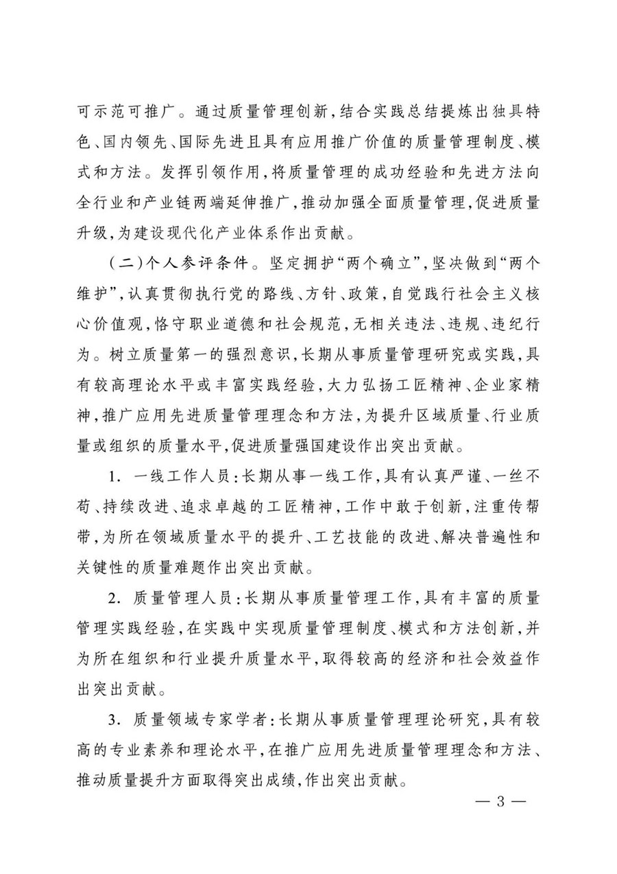 (二)個人參評條件。堅定擁護“兩個確立”,堅決做到“兩個維護”,認(rèn)真貫徹執(zhí)行黨的路線、方針、政策,自覺踐行社會主義核心價值觀,恪守職業(yè)道德和社會規(guī)范,無相關(guān)違法、違規(guī)、違紀(jì)行為。樹立質(zhì)量第一的強烈意識,長期從事質(zhì)量管理研究或?qū)嵺`,具有較高理論水平或豐富實踐經(jīng)驗,大力弘揚工匠精神、企業(yè)家精神,推廣應(yīng)用先進(jìn)質(zhì)量管理理念和方法,為提升區(qū)域質(zhì)量、行業(yè)質(zhì)量或組織的質(zhì)量水平,促進(jìn)質(zhì)量強國建設(shè)作出突出貢獻(xiàn)。