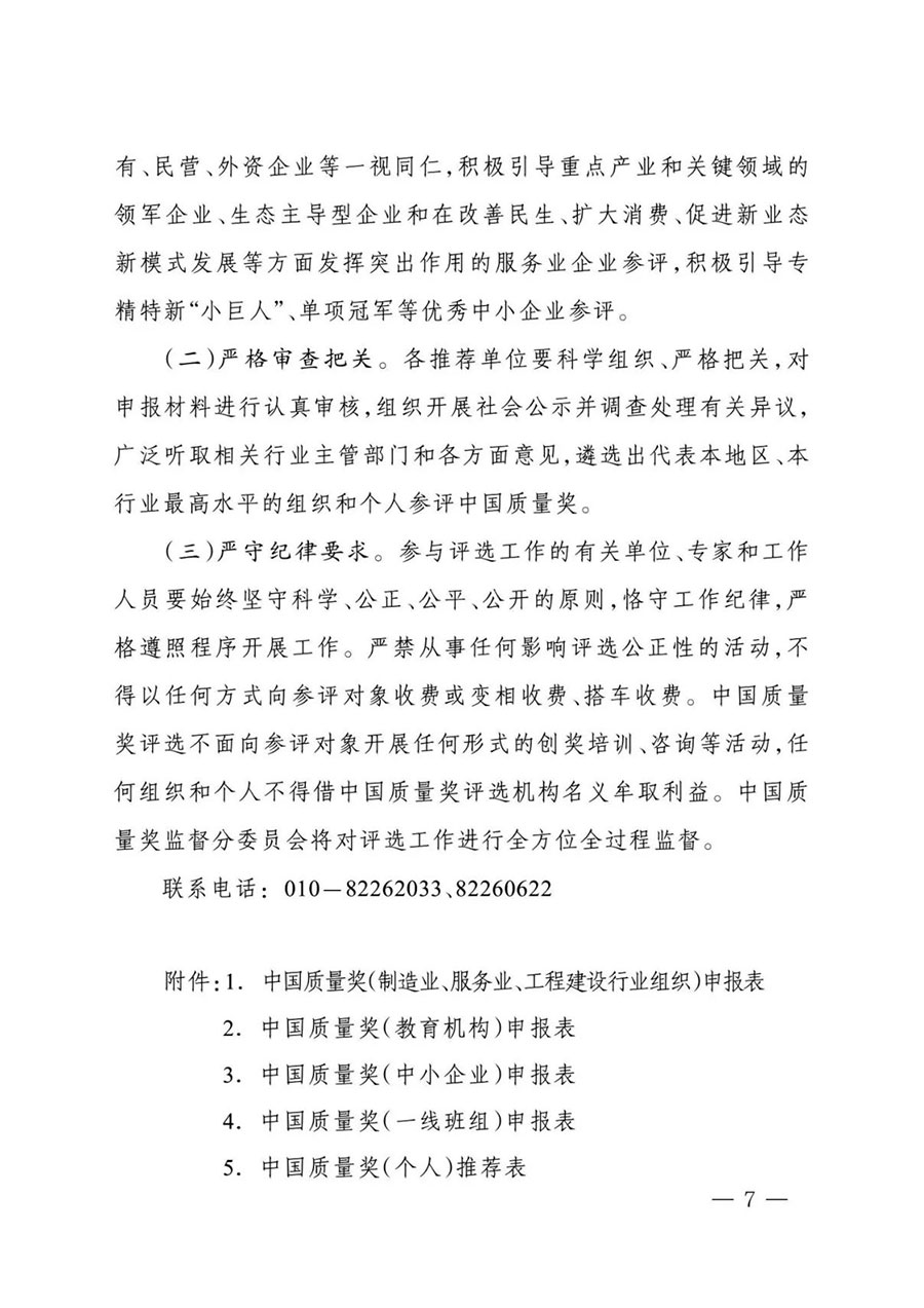審核推薦材料(包括紙質(zhì)版及電子版光盤或U盤)寄至中國質(zhì)量獎評選表彰委員會秘書處(地址:北京市東城區(qū)安定門外大街56號,市場監(jiān)管總局質(zhì)量發(fā)展局質(zhì)量管理處;郵編:100011),電子版材料同時發(fā)送至zgzlj@samr.gov.cn,郵件標(biāo)題為“推薦單位名稱+聯(lián)系人+手機號碼”。審核推薦材料包括:推薦函、推薦名單匯總表(見附件8)、申報材料。材料接收時間截止至6月19日。