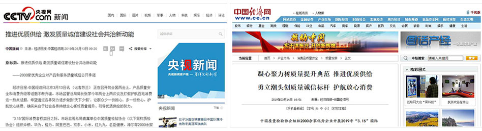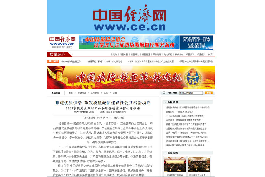 •中國經(jīng)濟網(wǎng)《推進優(yōu)質供給 激發(fā)質量誠信建設社會共治新動能 2000家優(yōu)秀企業(yè)對產(chǎn)品和服務質量誠信公開承諾》