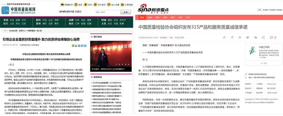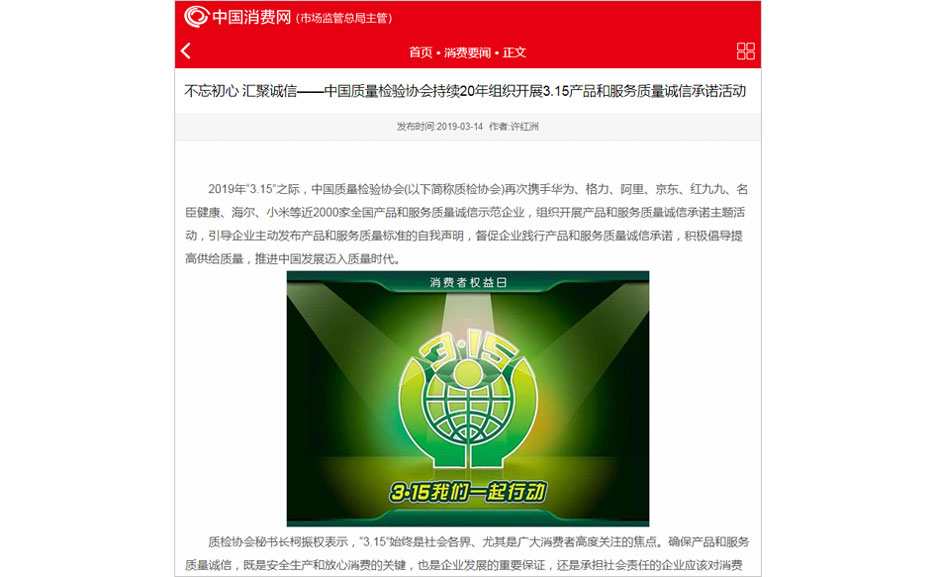 •中國消費網(wǎng)《傳遞質量信任,引導質量消費——中國質量檢驗協(xié)會在2019年3.15組織2000家優(yōu)秀企業(yè)對產(chǎn)品和服務質量作出誠信承諾》