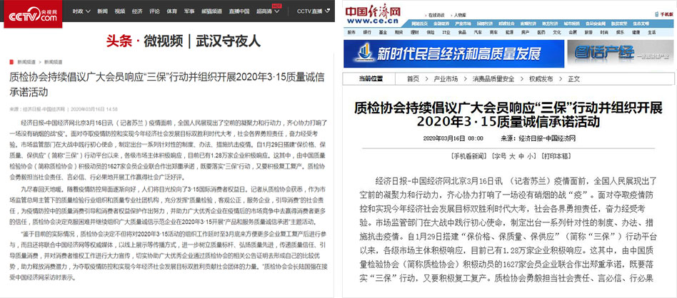 中國(guó)經(jīng)濟(jì)網(wǎng)《質(zhì)檢協(xié)會(huì)持續(xù)倡議廣大會(huì)員響應(yīng)“三保”行動(dòng)并組織開展2020年3·15質(zhì)量誠(chéng)信承諾活動(dòng)》