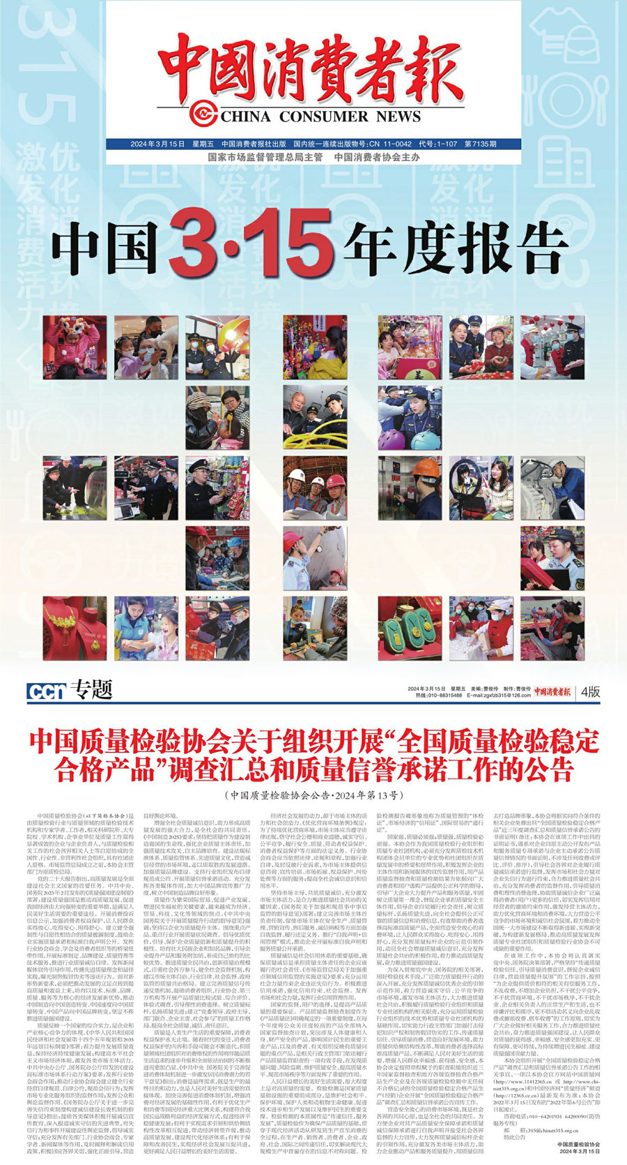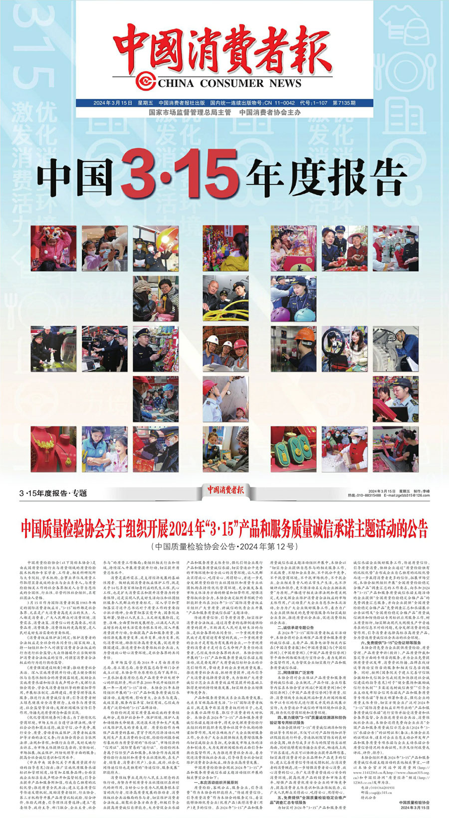 中國(guó)消費(fèi)者報(bào):中國(guó)質(zhì)量檢驗(yàn)協(xié)會(huì)關(guān)于組織開(kāi)展2024年“3·15”產(chǎn)品和服務(wù)質(zhì)量誠(chéng)信承諾主題活動(dòng)的公告