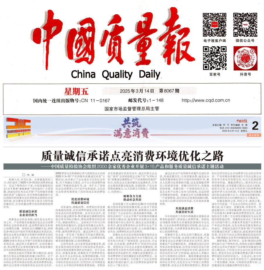 《中國質(zhì)量報(bào)》(2025年3月14日刊)發(fā)布:質(zhì)量誠信承諾點(diǎn)亮消費(fèi)環(huán)境優(yōu)化之路——中國質(zhì)量檢驗(yàn)協(xié)會組織2000余家優(yōu)秀企業(yè)開展3·15產(chǎn)品和服務(wù)質(zhì)量誠信承諾主題活動
