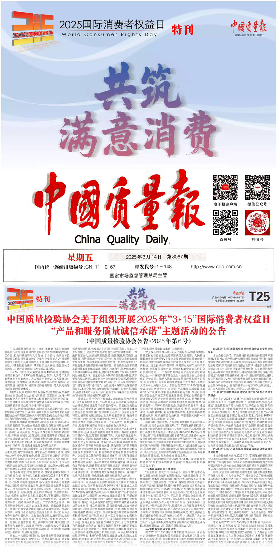 《中國質(zhì)量報(bào)》(2025年3月14日刊)發(fā)布:中國質(zhì)量檢驗(yàn)協(xié)會關(guān)于組織開展2025年“3·15”國際消費(fèi)者權(quán)益日“產(chǎn)品和服務(wù)質(zhì)量誠信承諾”主題活動的公告(2025年第6號)