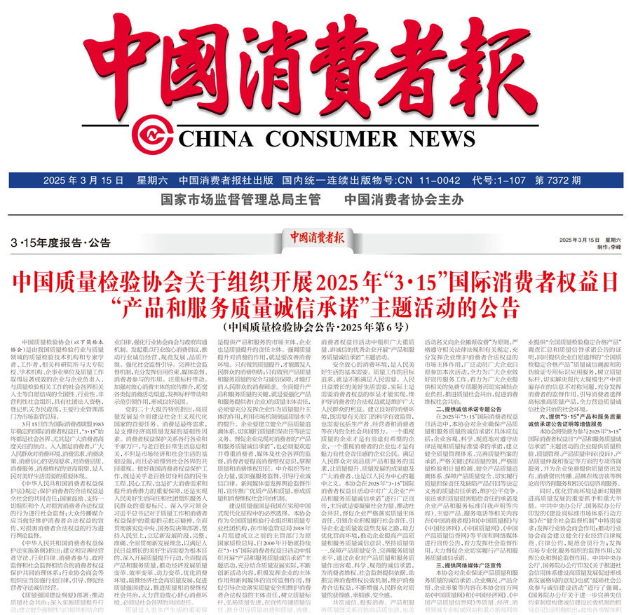 《中國消費(fèi)者報(bào)》(2025年3月15日刊)發(fā)布:中國質(zhì)量檢驗(yàn)協(xié)會關(guān)于組織開展2025年“3·15”國際消費(fèi)者權(quán)益日“產(chǎn)品和服務(wù)質(zhì)量誠信承諾”主題活動的公告(2025年第6號)