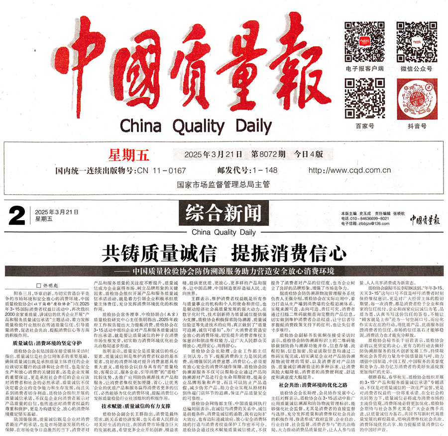 《中國質(zhì)量報(bào)》(2025年3月21日刊)發(fā)布:共鑄質(zhì)量誠信 提振消費(fèi)信心——中國質(zhì)量檢驗(yàn)協(xié)會防偽溯源服務(wù)助力營造安全放心消費(fèi)環(huán)境