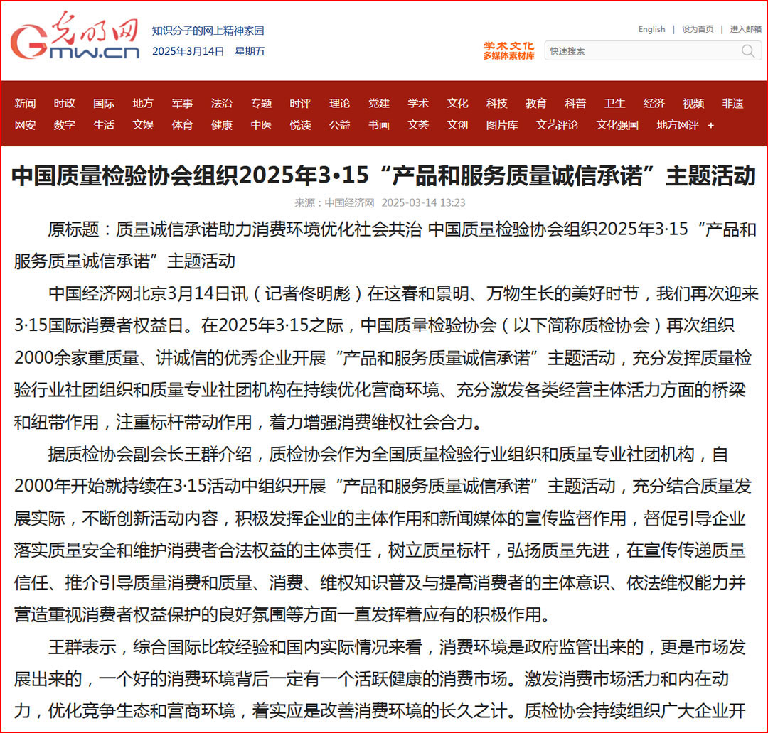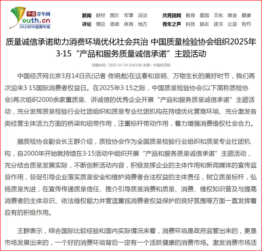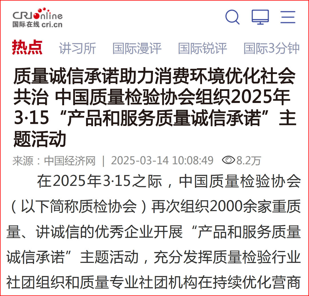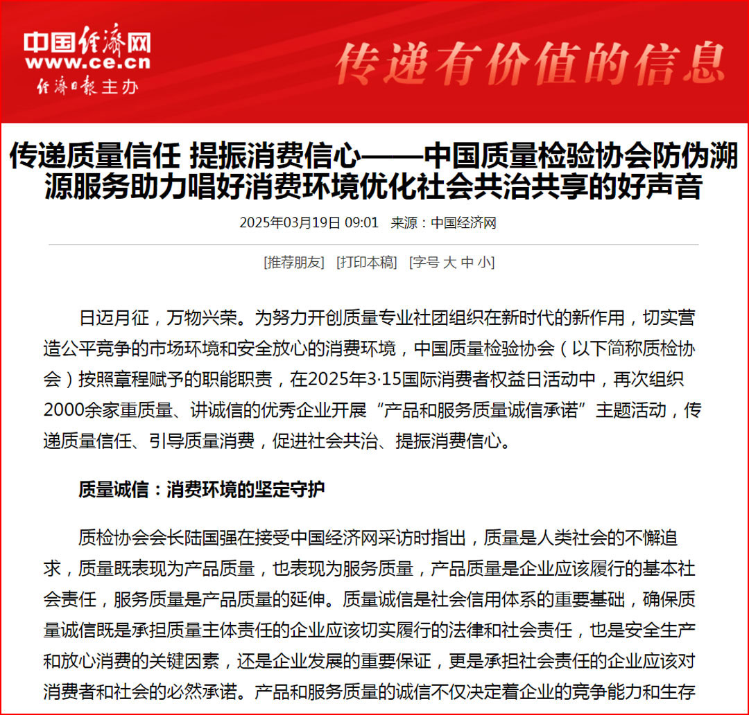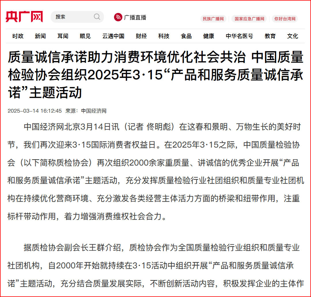 中國經(jīng)濟(jì)網(wǎng)“質(zhì)量經(jīng)濟(jì)頻道”發(fā)布:質(zhì)量誠信承諾:消費(fèi)環(huán)境和消費(fèi)維權(quán)優(yōu)化社會共治的基石——中國質(zhì)量檢驗(yàn)協(xié)會組織2000余家優(yōu)秀企業(yè)開展2025年3·15“產(chǎn)品和服務(wù)質(zhì)量誠信承諾”主題活動