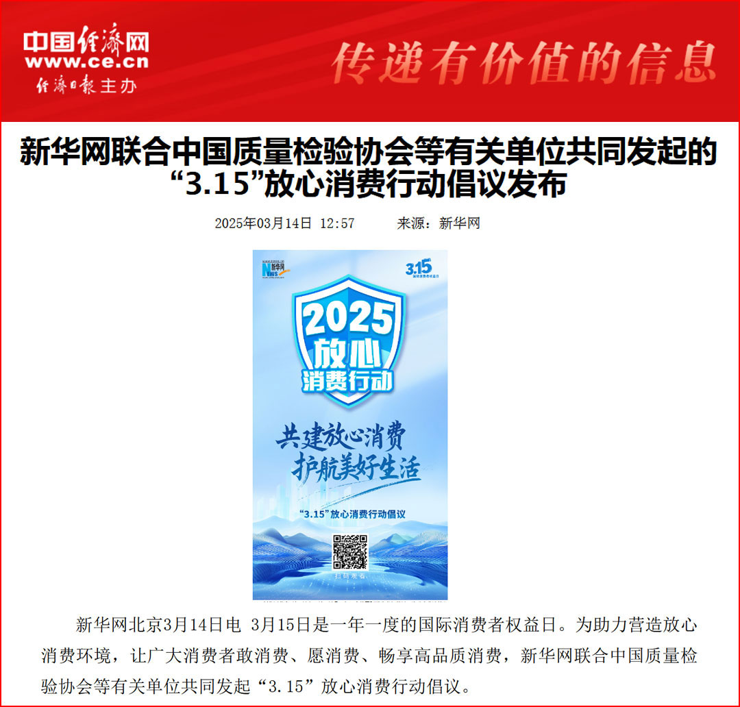中國經(jīng)濟(jì)網(wǎng)“質(zhì)量經(jīng)濟(jì)頻道”發(fā)布:中國質(zhì)量檢驗(yàn)協(xié)會開展2025年3·15“產(chǎn)品和服務(wù)質(zhì)量誠信承諾”主題活動