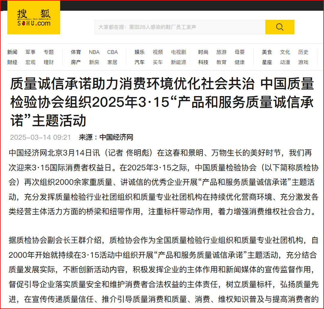 搜狐網(wǎng)報(bào)道:質(zhì)量誠信承諾助力消費(fèi)環(huán)境優(yōu)化社會共治——中國質(zhì)量檢驗(yàn)協(xié)會組織2025年3·15“產(chǎn)品和服務(wù)質(zhì)量誠信承諾”主題活動
