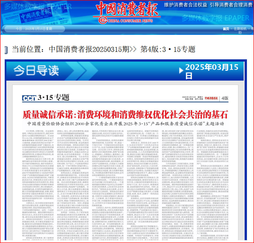《中國消費(fèi)者報(bào)》(2025年3月15日刊)發(fā)布:質(zhì)量誠信承諾:消費(fèi)環(huán)境和消費(fèi)維權(quán)優(yōu)化社會共治的基石——中國質(zhì)量檢驗(yàn)協(xié)會組織2000余家優(yōu)秀企業(yè)開展2025年3·15“產(chǎn)品和服務(wù)質(zhì)量誠信承諾”主題活動