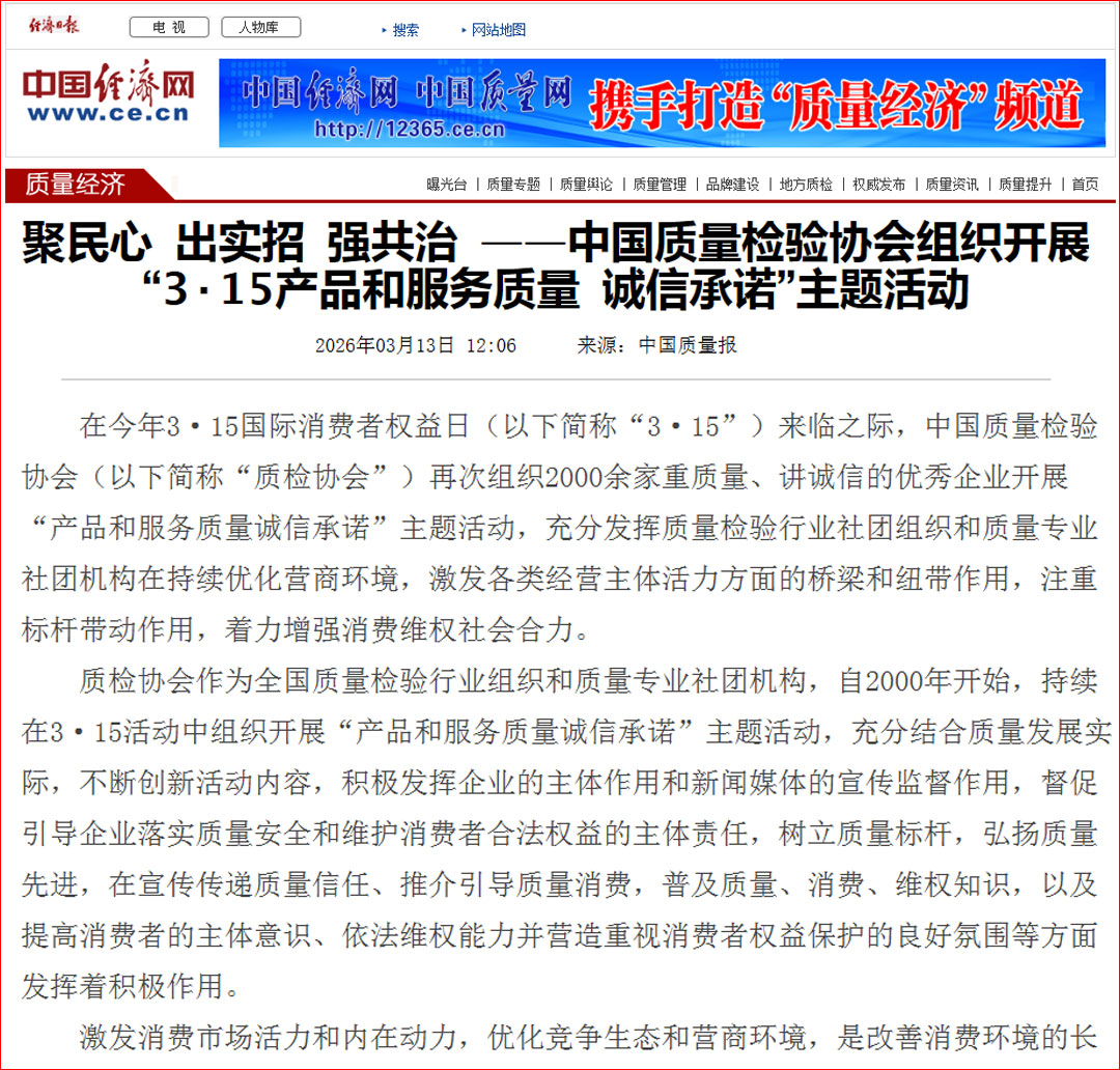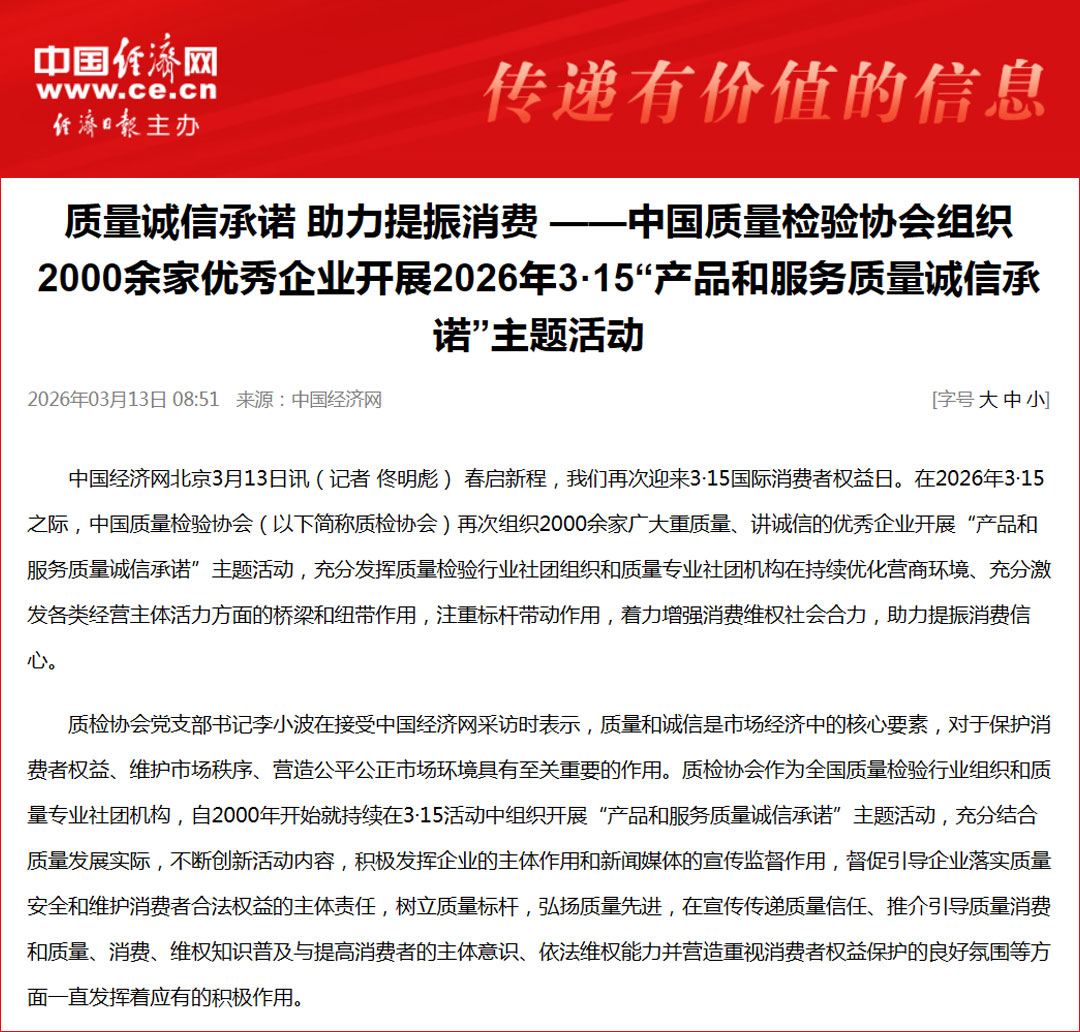 中國經(jīng)濟網(wǎng)發(fā)布:質(zhì)量誠信承諾 助力提振消費——中國質(zhì)量檢驗協(xié)會組織2000余家優(yōu)秀企業(yè)開展2026年3·15“產(chǎn)品和服務(wù)質(zhì)量誠信承諾”主題活動