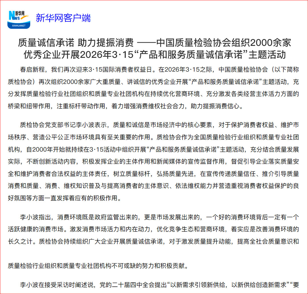 新華網(wǎng)客戶端報道:質(zhì)量誠信承諾 助力提振消費——中國質(zhì)量檢驗協(xié)會組織2000余家優(yōu)秀企業(yè)開展2026年3·15“產(chǎn)品和服務(wù)質(zhì)量誠信承諾”主題活動