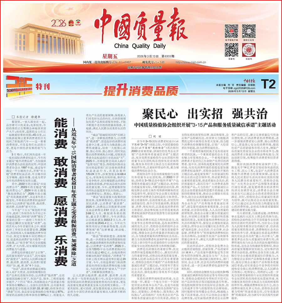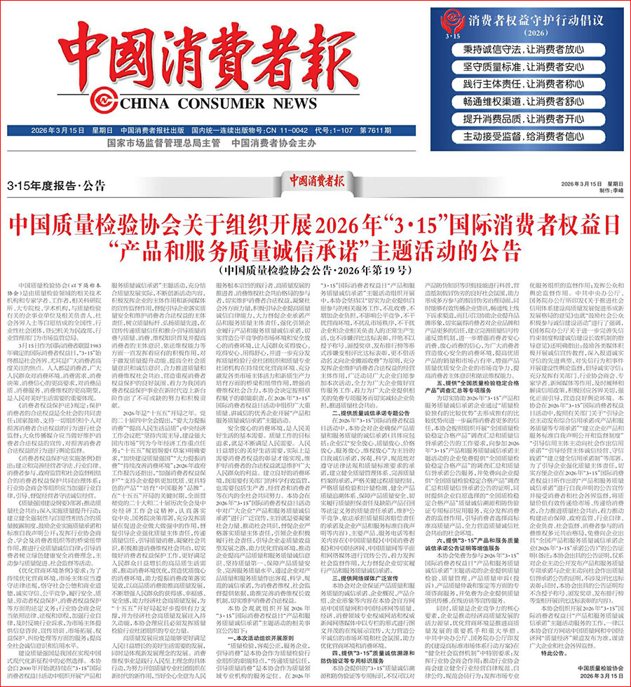 《中國消費者報》(2026年3月15日刊)發(fā)布:中國質(zhì)量檢驗協(xié)會關(guān)于組織開展2026年“3·15”國際消費者權(quán)益日“產(chǎn)品和服務(wù)質(zhì)量誠信承諾”主題活動的公告(中國質(zhì)量檢驗協(xié)會公告·2026年第19號)