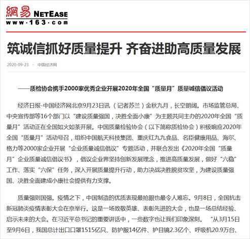 網易:筑誠信抓好質量提升 齊奮進助高質量發(fā)展——質檢協會攜手2000家優(yōu)秀企業(yè)開展2020年全國“質量月”質量誠信倡議活動