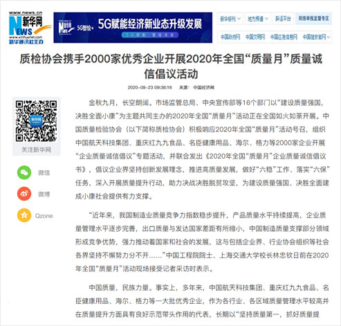 新華網:質檢協會攜手2000家優(yōu)秀企業(yè)開展2020年全國“質量月”質量誠信倡議活動